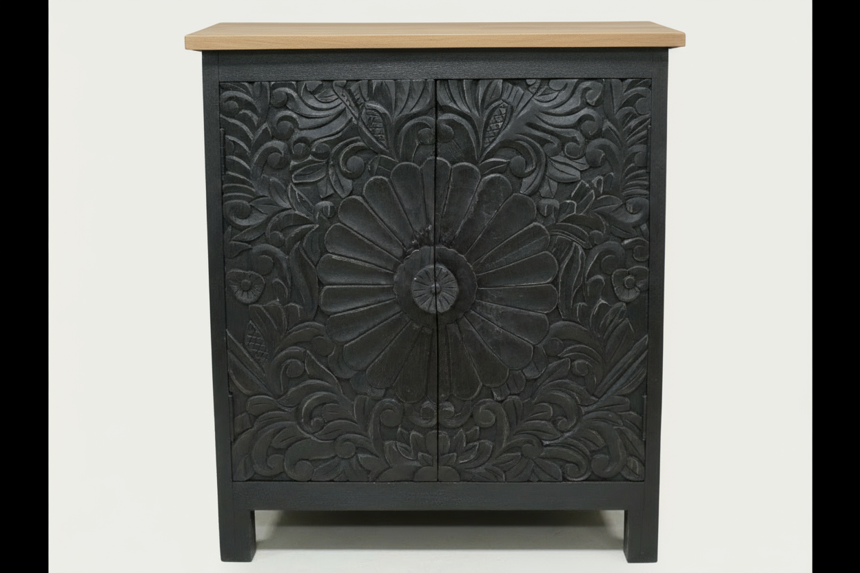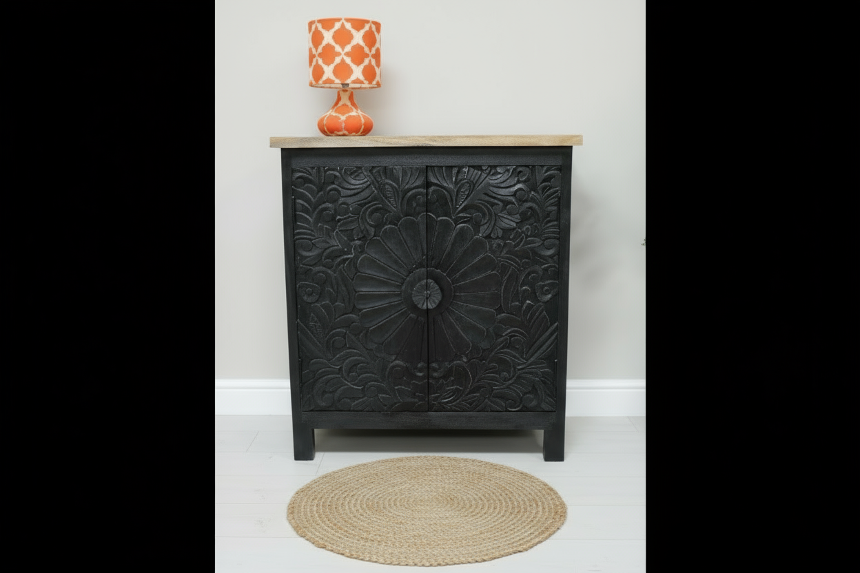 Made from mango wood which is smooth to the touch with a black rustic paint finish and decorative ornate hand carvings.