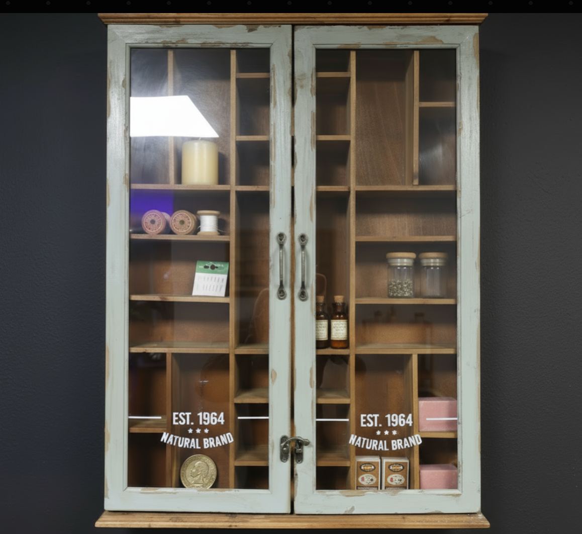 Glass fronted rustic wood collectors wall display cabinet