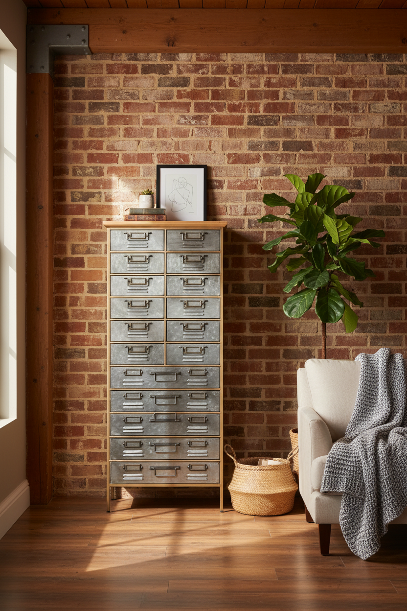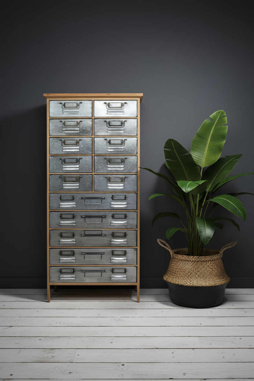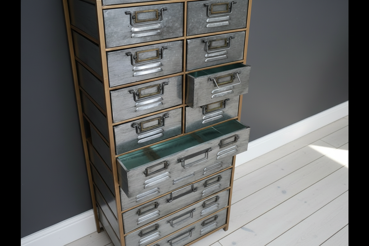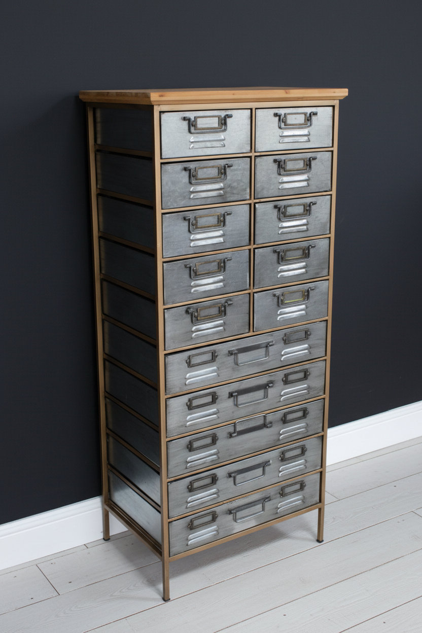 Tall industrial cabinet with 15 metal drawers