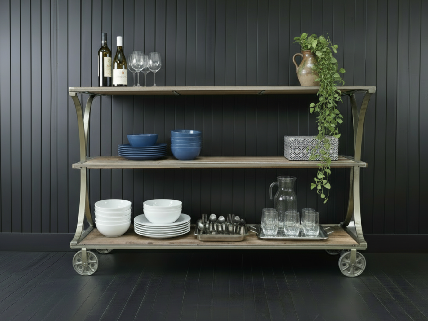 Wide rustic 3 tier display shelves trolley on wheels
